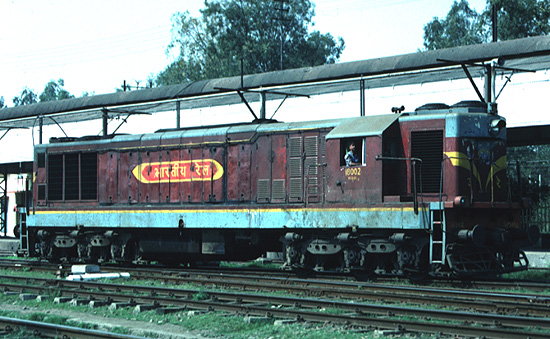 GT16 18002 EMD 2400hp (derated to 2250 hp) Co-Co, class WDM4 at Varanasi February 15, 1998 by Larry Russell. These are passenger engines on the Northern Railway stabled at Mughal Sarai. Some have been retired, all are dual controlled and have dynamic brakes in the short hood. This is the export version of the SD24.