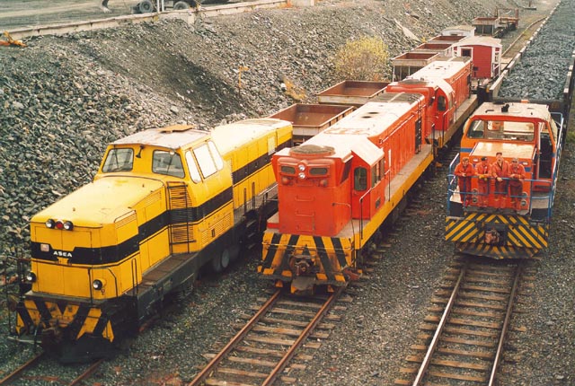 This 8 km line also happens to be the nothernmost railroad in the world. Traffic ceased in april 1997 due to mine closing, but the railroad equipment is still maintained for future mining operations of the new owner Arctic Bulk Minerals (ABM) a company owned by Ivanhoe Mines Ltd. G12 locomotives DE100 (1954, owned since 1998 by Sor-Varanger museum) and DE101 (1956, ABM) is kept in the loco shed in Kirkenes with the newer DH103 (Krupp/Mak model G1203) delivered to Sydvaranger in Nov. 1990. Sydvaranger also bought a used ASEA T45 from Sweden in 1984, but was not a success plagued with failures and was finaly taken out of service in 1990. The unit was scrapped in 1998.