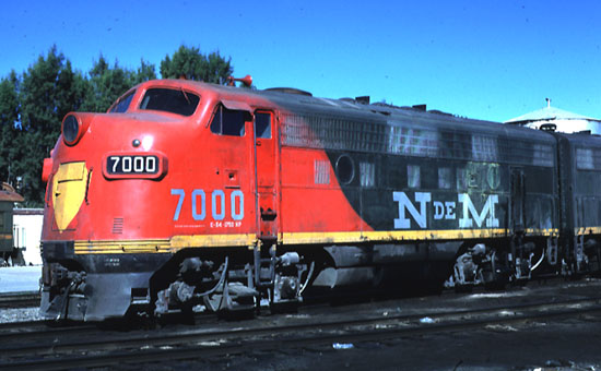 NdeM 7000 EMD F9A Bo-Bo 1750 hp at Aguascalientes March 4 1980 by Jim Herold.