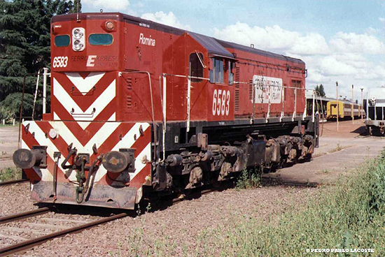 FEPSA 6583 EMD GR12 Co-Co 1310 hp switching a wheat train in Mercedes's town (BA). November 1997. Photo by Pablo Lacoste.