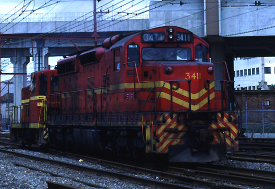 RFFSA 3411 EMD SD18 Co-Co 1800 hp running with a GE 70 Ton at Sao Paulo April 6 1980 by Keith Ardinger. (1.6 meter gauge)