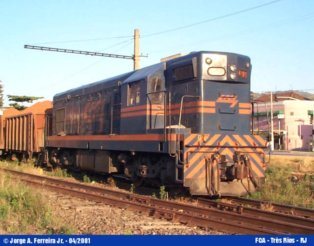 FCA 4181 is a G12 Bo-Bo 1310 hp 1 meter gauge. Photo by Jorge A. Ferreira Jr. at Tres Rios RJ, April 2001..